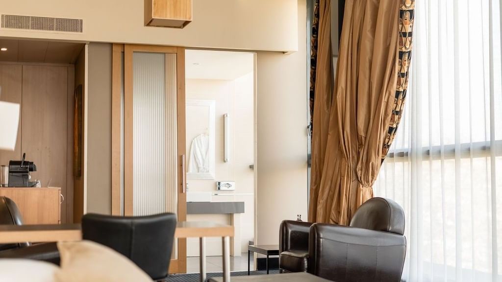 In a modern setting, our suites offer exceptional facilities for an idyllic stay in the Seine-Maritime. Bathed in light and air-conditioned with 35 m² of floor space, they have a flat-screen TV with satellite and cable channels for your enjoyment. Each suite has a lounge area, a safe, telephone, wardrobe or closet, minibar and coffee machine. The bathroom has complimentary toiletries, bathrobes and a hairdryer. Wi-Fi is available free of charge.